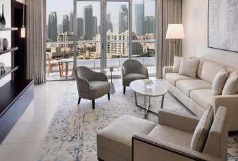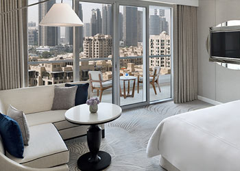 In addition to a king-size bed, a built-in closet, and a bathroom with a vanity area, the Premier Rooms are reassuringly welcoming and spacious. With a balcony that looks out onto the city, the nearby district of Business Bay.