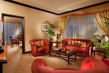 Our Executive Suite boasts a very spacious sitting room for relaxation with comfortable sofas and armchairs plus a private dining or meeting area centred around a table which can accommodate up to six people as well as a bedroom with a King-size bed and a beautifully fitted bathroom with a full-size bathtub, a separate shower, a bidet, a hair dryer and bathrobes. Mineral water is provided daily, as well steady Wi-Fi connection, and complimentary access to recreation facilities and an equipped Business Centre.