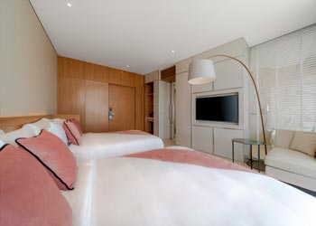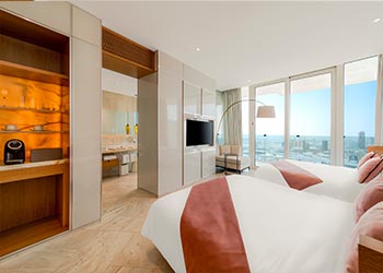 Fashionable comes in pairs. Ideal for those traveling with friends or family, our hallmark floor-to-ceiling windows, private balcony and two Queen beds. Complete with complimentary Wi-Fi, the latest in-room entertainment and luxe Rituals bathroom amenities.