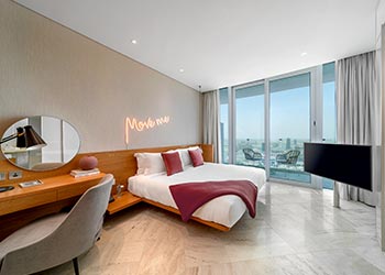 Sleep in fashion and wake up in style with floor-to-ceiling windows, private balcony and a comfortable King bed. Generous in proportion and well appointed, the perfect home away from home offering complimentary Wi-Fi, refreshments and the latest in-room entertainment.