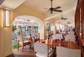 Multiple dining venues showcasing Goan-Portuguese specialties, international cuisines, beachfront grills, and relaxed lounges.