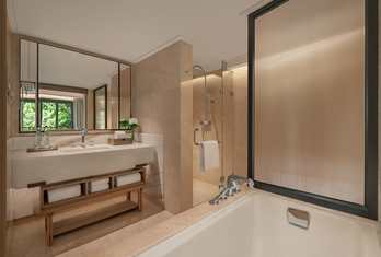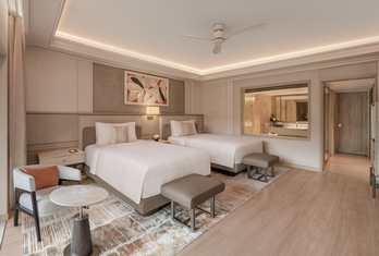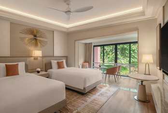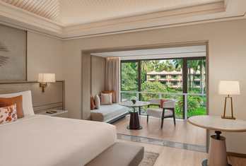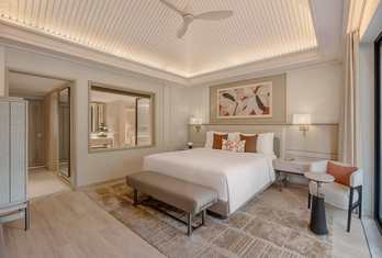 The lush tropical landscape features elegantly designed rooms, suites, and private pool villas offering garden, lagoon, or sea views. Interiors reflect contemporary luxury with spacious layouts, marble bathrooms, private balconies or terraces, and premium amenities.