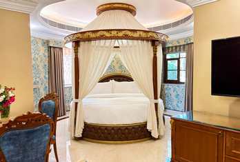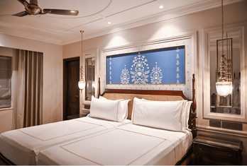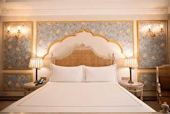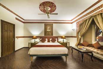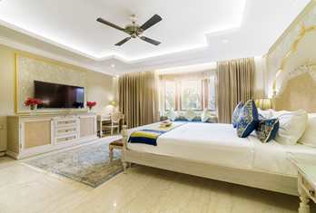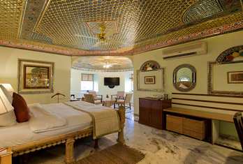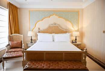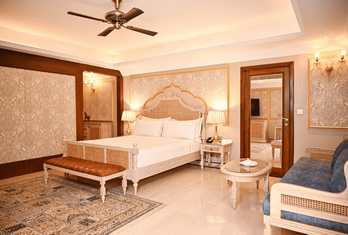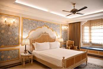 The hotel offers approximately 90–98 well-appointed rooms and suites, including Deluxe Rooms, Super Deluxe Rooms, Suites, Golden Suites and the Sheesh Mahal Suite, all designed with heritage accents and modern comforts. Palace Rooms & Pool-View Rooms – Spacious rooms with classic décor and modern amenities, often with garden or courtyard views. Jaisalmer Suite & Royal Palace Rooms – Larger layouts with enhanced living space. Sheesh Mahal Suite & Family Suites – Top-end suites featuring traditional design elements like mirror work and expansive interiors. In-room amenities typically include air conditioning, attached bath, satellite TV, minibar, telephone, Wi-Fi and 24-hour room service.