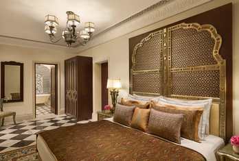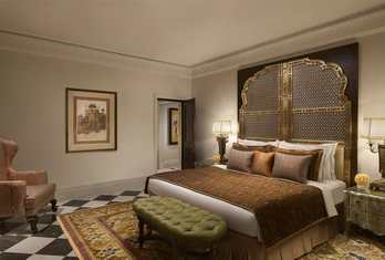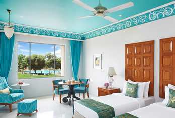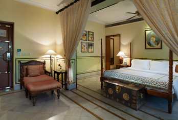 The hotel features around 100 rooms and suites designed with classic Rajasthani and colonial décor. Room categories typically include Deluxe Rooms, Luxury Rooms, Luxury Rooms with Private Sit-Outs, and themed Luxury Suites (e.g., Junior, Crystal, Jaipur, Peacock, Gangaur). Rooms are furnished with quality amenities such as air conditioning, free Wi-Fi, minibars, tea/coffee makers, safes and flat-screen TVs. Suites often offer separate living areas and charming views over the gardens or courtyards.
