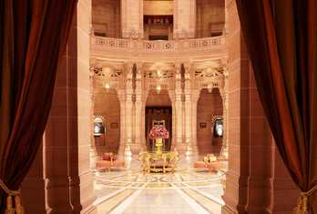 The palace offers spectacular views of the Blue City and Mehrangarh Fort from its hilltop position. It sits within a 26-acre estate with lush gardens and open courtyards, blending royal heritage architecture with luxury hotel services.