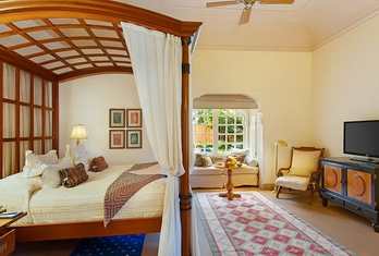 The resort offers elegantly designed villas, tents and rooms set around private courtyards, blending Rajput style with modern comfort. Categories typically include Premier Rooms, Premier Rooms with Private Garden, Luxury Tents, Royal Tent, Luxury Villas with Private Pool and the ultra-luxury Kohinoor Villa with private pool and extensive living space. All accommodations feature luxury amenities such as air conditioning, soundproofing, tea/coffee facilities, minibar, ensuite bathrooms with bathtubs and showers, and complimentary Wi-Fi. Select villas and tents offer private plunge pools, outdoor patios and dedicated butler service for an elevated stay experience.